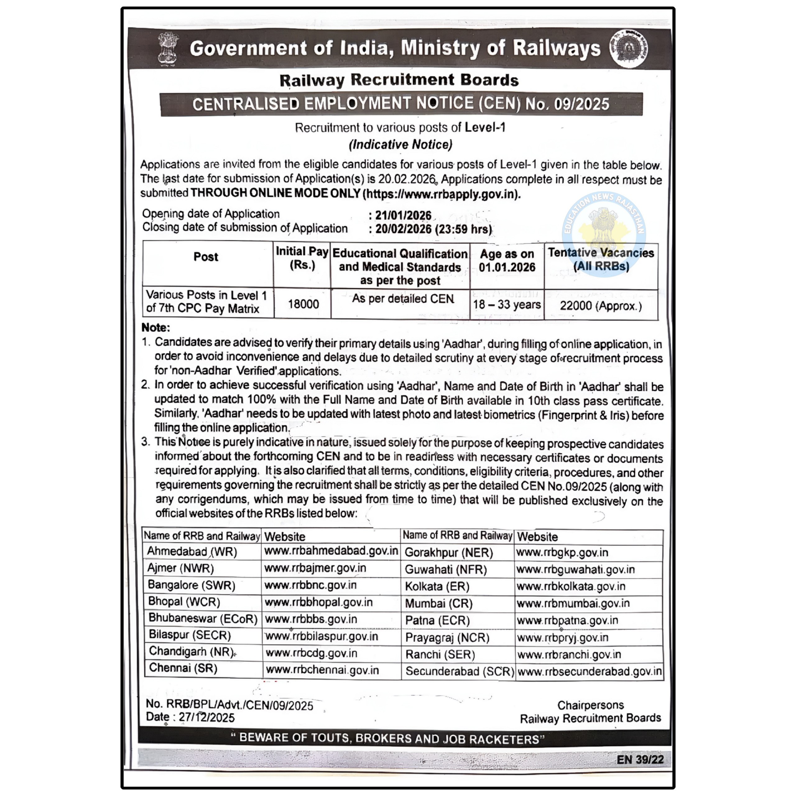 Railway Group D 22,000 posts: Short notification released. रेलवे रिक्रूटमेंट बोर्ड ने एक शॉर्ट नोटिफिकेशन जारी किया है, जिसके तहत ग्रुप डी लेवल वन के पदों पर नई वैकेंसी निकल गई है. यह रेलवे ग्रुप डी की नई वैकेंसी 2026 में आयोजित की जाएगी, जिसके लिए ऑनलाइन आवेदन 21 जनवरी 2026 से आधिकारिक वेबसाइट पर शुरू किया जाएंगे. जो भी उम्मीदवार इससे वैकेंसी में अप्लाई करना चाहते हैं वह 20 फरवरी 2026 तक ऑनलाइन अप्लाई कर सकते हैं. यह भारती 22,000 से ज्यादा पदों पर आयोजित की जाएगी. इसलिए जो भी उम्मीदवार रेलवे ग्रुप डी की तैयारी कर रहे हैं वहनीचे दी गई पूरी डिटेल को ध्यानपूर्वक पड़े.